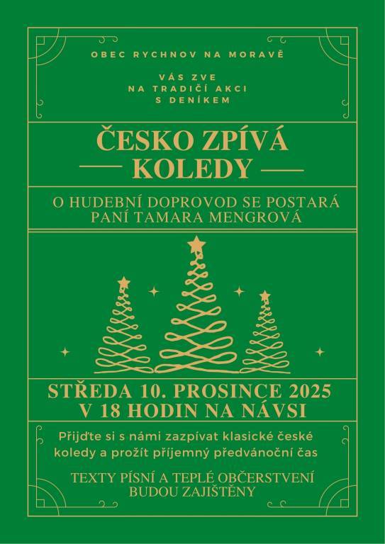 Obec Rychnov na Moravě Vás srdečně zve na akci Česko zpívá koledy s regionálním deníkem, která se bude konat ve středu 10. prosince od 18 hodin ve vyhřívaném stanu na návsi. Teplé občerstvení s vůní vánoc bude zajištěno.