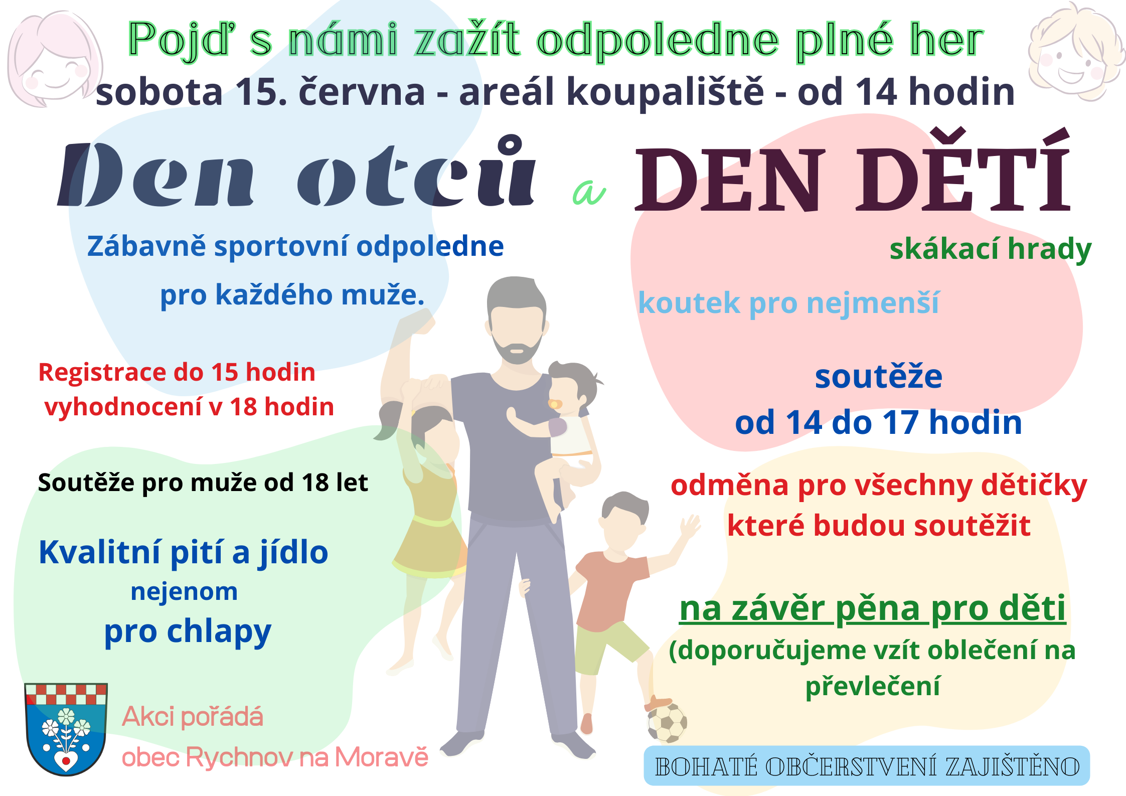 Obec Rychnov na Moravě pořádá Den otců a Den dětí. Přijďte v sobotu 15. června do areálu koupaliště a určitě se nudit nebudete. Bohaté občerstvení je samozřejmostí.