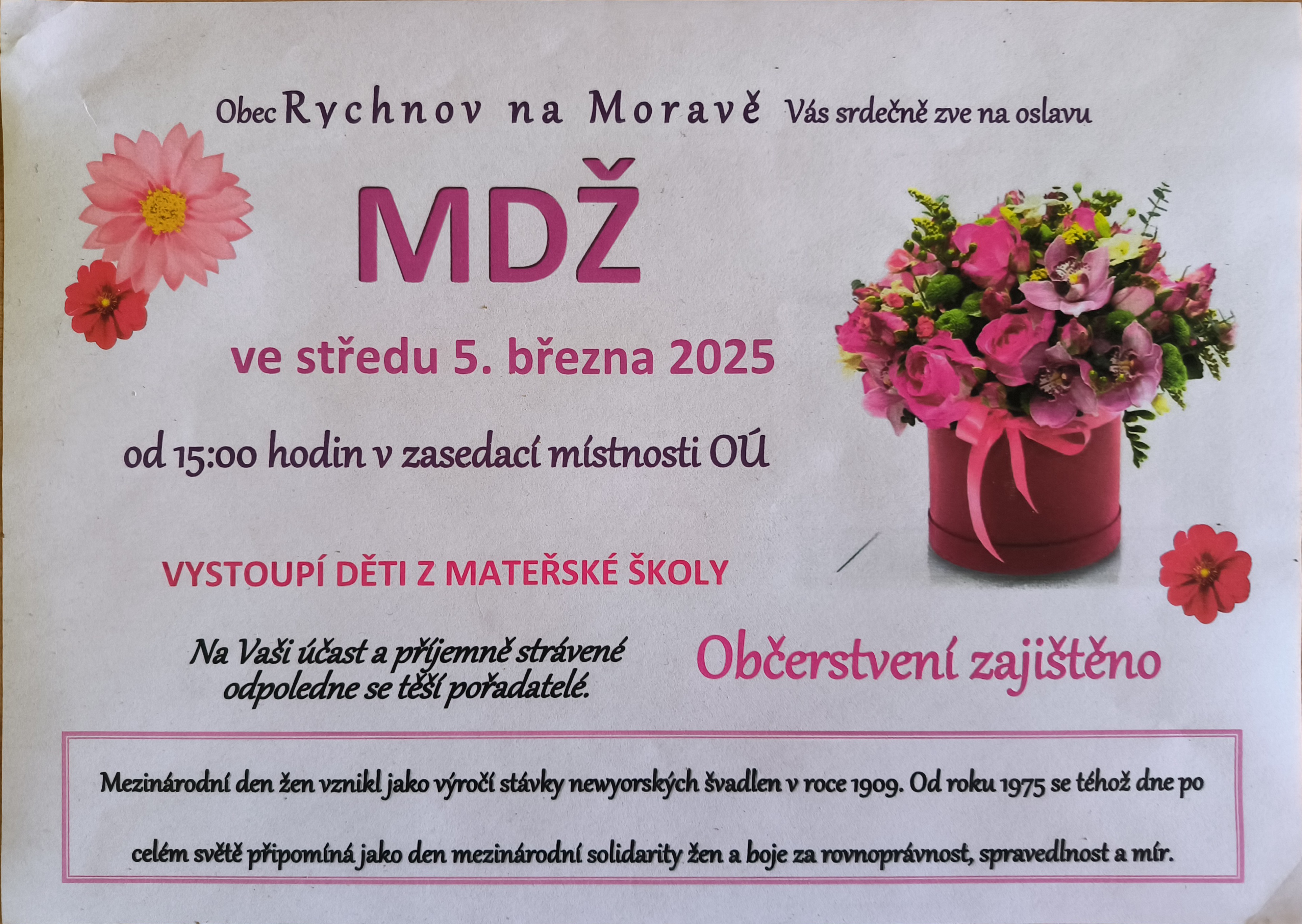 Srdečně Vás zveme na oslavu Mezinárodního Dne Žen, která se bude konat ve středu 5. března od 15 hodin v zasedací místnosti OÚ. Vystoupí děti z MŠ, občerstvení bude zajištěno.