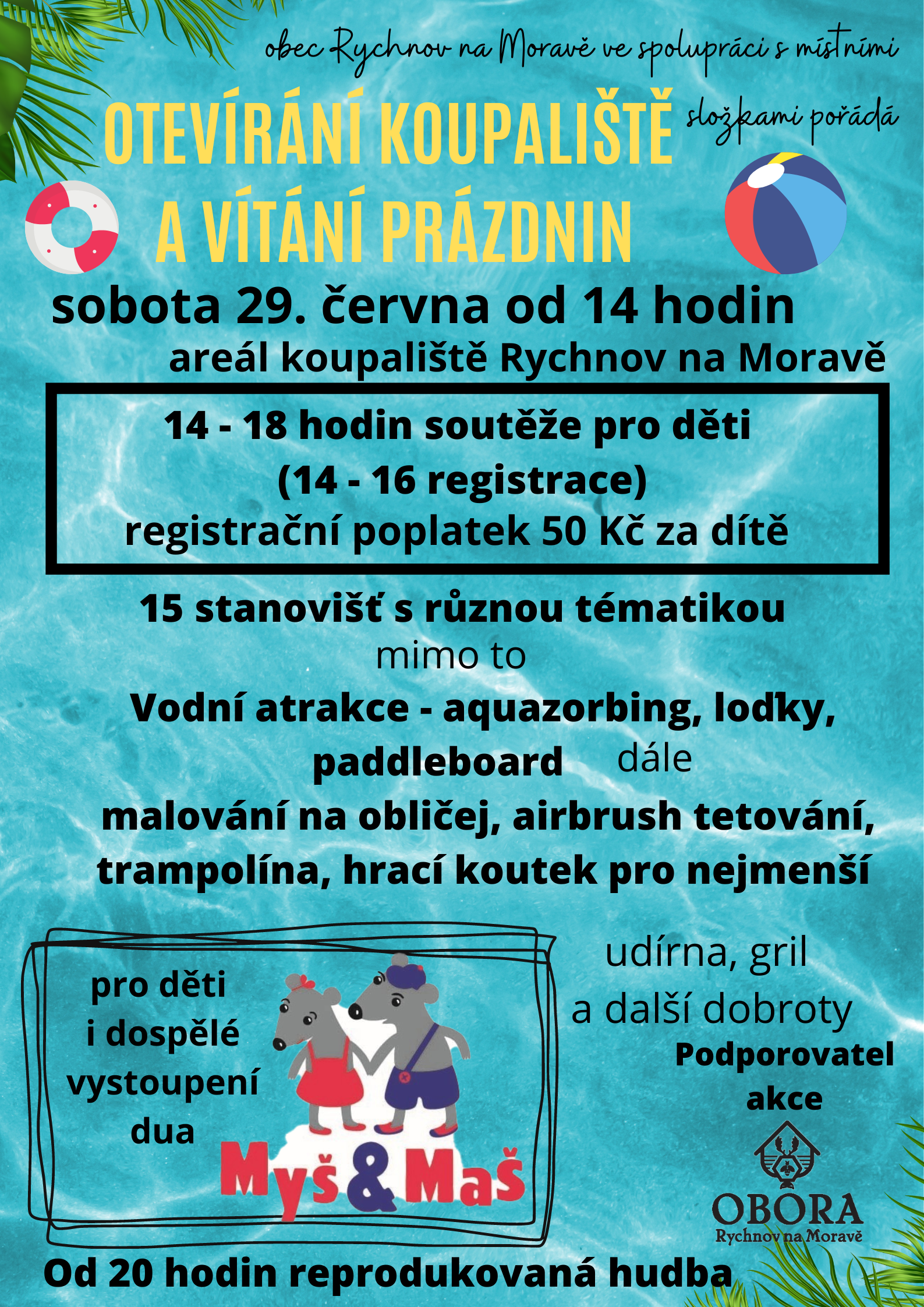 Obec Rychnov na Moravě Vás srdečně zve na největší akci v roce - Otevírání koupaliště a vítání prázdnin. Akce se koná v sobotu 29. června od 14 hodin na koupališti. Více informací naleznete na plakátu v příloze.