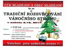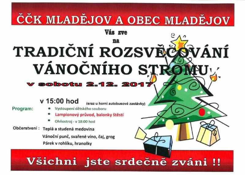 ČČK a Obec Mladějov na Moravě Vás zvou na Tradiční rozsvěcování vánočního stromu, které se uskuteční v sobotu 2. 12. 2017 u horní autobusové zastávky v 15:00 hodin. Rozsvěcování zahájí děti z MŠ, následuje lampionový průvod, pouštění lampionů štěstí a v 18:00 hodin se můžete těšit na ohňostroj. Občerstvení zajištěno (vánoční punč, svařené víno, čaj, grog, párky v rohlíku). Všichni jste srdečně zváni!