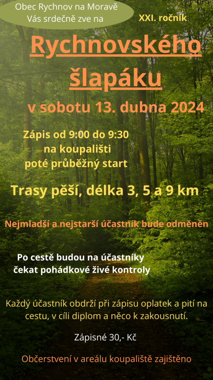 Obec Rychnov na Moravě Vás srdečně zve na tradiční Rychnovský šlapák, který se bude konat v sobotu 13. dubna. Zápis o 9:00 do 9:30 na místním koupališti, poté bude následovat průběžný start. Trasy pěší 3, 5 a 9 km. Po cestě na Vás budou čekat živé pohádkové kontroly. Zápisné je 30,- Kč /osoba. Po zápisu obdrží každý účastník pití na cestu a sušenku, po zdolání trasy v cíli diplom a něco k zakousnutí. V areálu koupaliště bude zajištěno občerstvení.