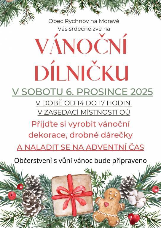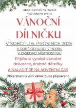 Obec Rychnov na Moravě Vás srdečně zve na VÁNOČNÍ DÍLNIČKU, která se bude konat v sobotu 6. prosince od 14 do 17 hodin v zasedací místnosti OÚ. Přijďte si vyrobit něco pro radost a nasát přitom vánoční atmosféru. Občerstvení s vůní vánoc bude zajištěno.