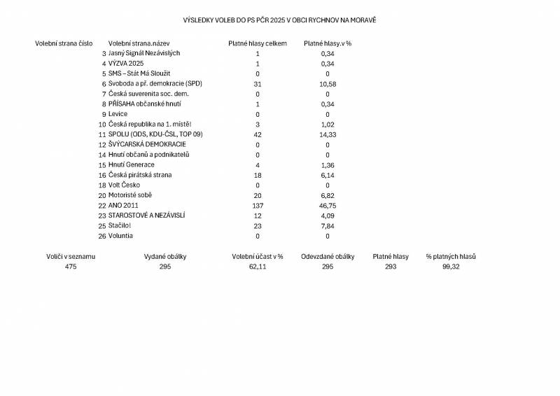Výsledky hlasování v naší obci - ANO 2011 46,75%, SPOLU 14,33%, SPD 10,58 %, STAČILO! 7,84%, MOTORISTÉ SOBĚ 6,82% , PIRÁTI 6,14, další strany získaly méně než 5%. Podrobné výsledky najdete v příloze a na úřední desce obce.