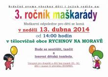 Srdečně zveme všechny děti i jejich rodiče na 3. ročník MAŠKARÁDY. Maškarní odpoledne pro děti se koná v neděli 13. dubna 2014 od 14:00 hodin v místní tělocvičně. Více informací nalenete na plakátu.