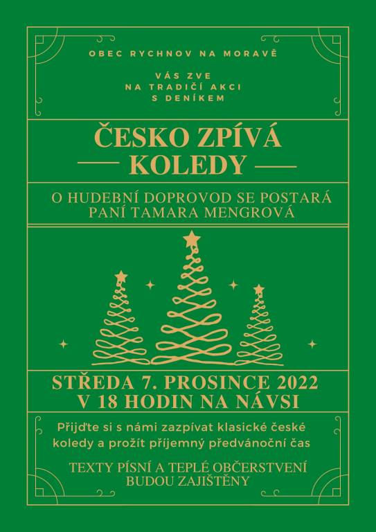 Srdečně Vás zveme na tradiční akci Česko zpívá koledy s deníkem, která se koná ve středu 7. prosince v 18 hodin na návsi. Hudební doprovod zajistí paní Tamara Mengrová. Texty písní a teplé občerstvení bude zajištěno.
