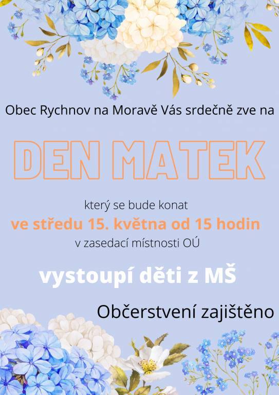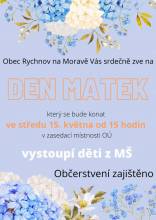 Obec Rychnov na Moravě Vás srdečně zve na oslavu DNE MATEK, která se bude konat ve středu 15. května od 15 hodin v zasedací místnosti OÚ. Vystoupí děti z MŠ. Občerstvení zajištěno.