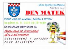 Srdečně zveme všechny maminky, babičky a tetičky na Den matek, který se koná v pátek 6. května od 15 hodin v zasedací místnosti OÚ. Vystoupí děti z MŠ Rychnov. Občerstvení a kytičky jsou připraveny.