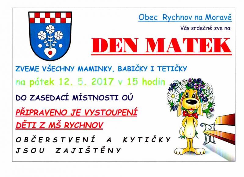 Srdečně zveme všechny maminky, babičky a tetičky na Den matek, který se koná v pátek 12. května od 15 hodin v zasedací místnosti OÚ. Vystoupí děti z MŠ Rychnov. Občerstvení je zajištěno. Každá žena dostane kytičku.