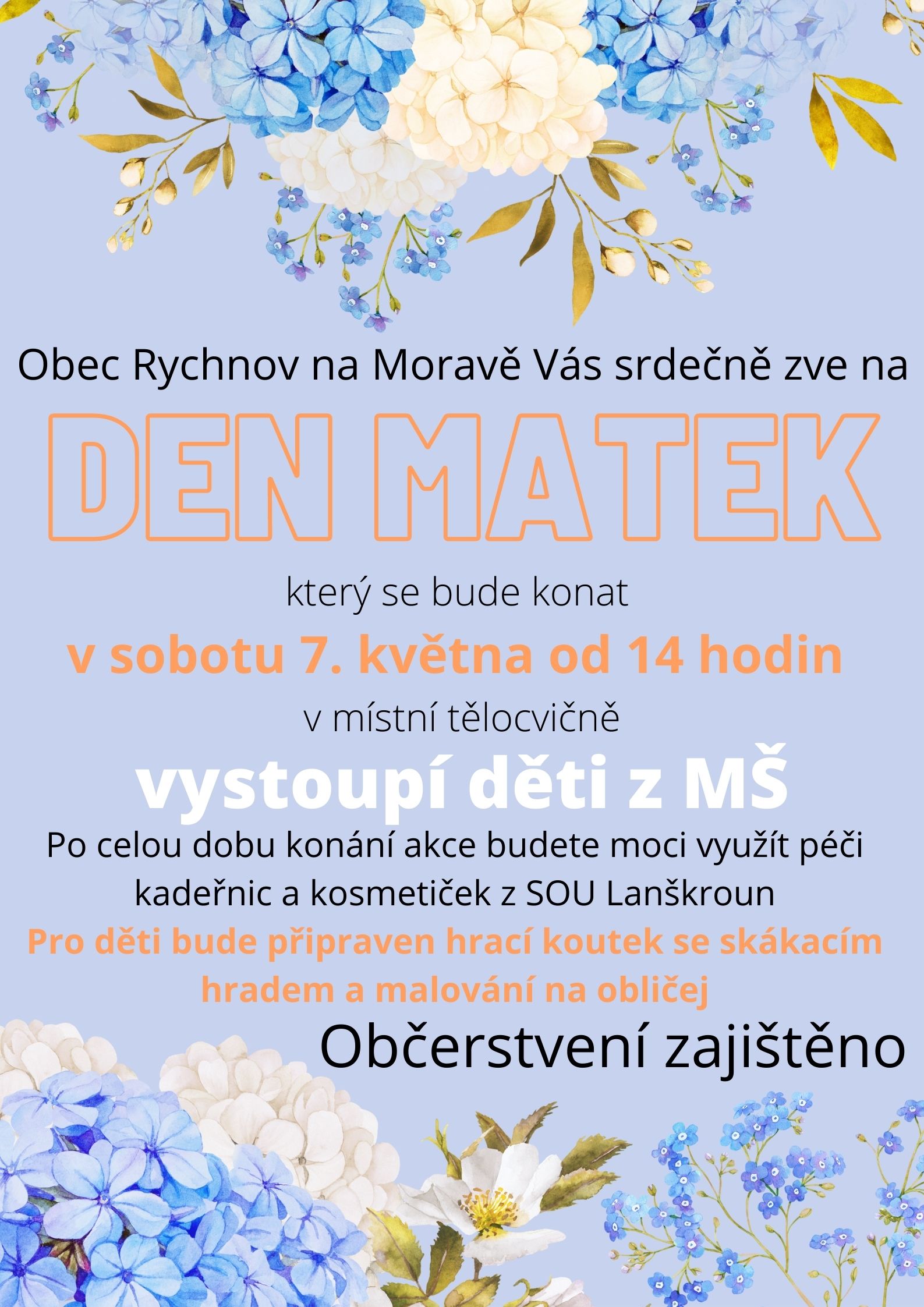 Obec Rychnov na Moravě Vás srdečně zve na oslavu Dne matek, která se bude konat v sobotu 7. května od 14 hodin v místní tělocvičně. Připraveno je vystoupení dětí z MŠ. Po celou dobu akce budete moci využít služby kadeřnice a kosmetičky z SOU Lanškroun. Pro děti bude připraven hrací koutek se skákacím hradem. Obcerstvení bude zajištěno.
