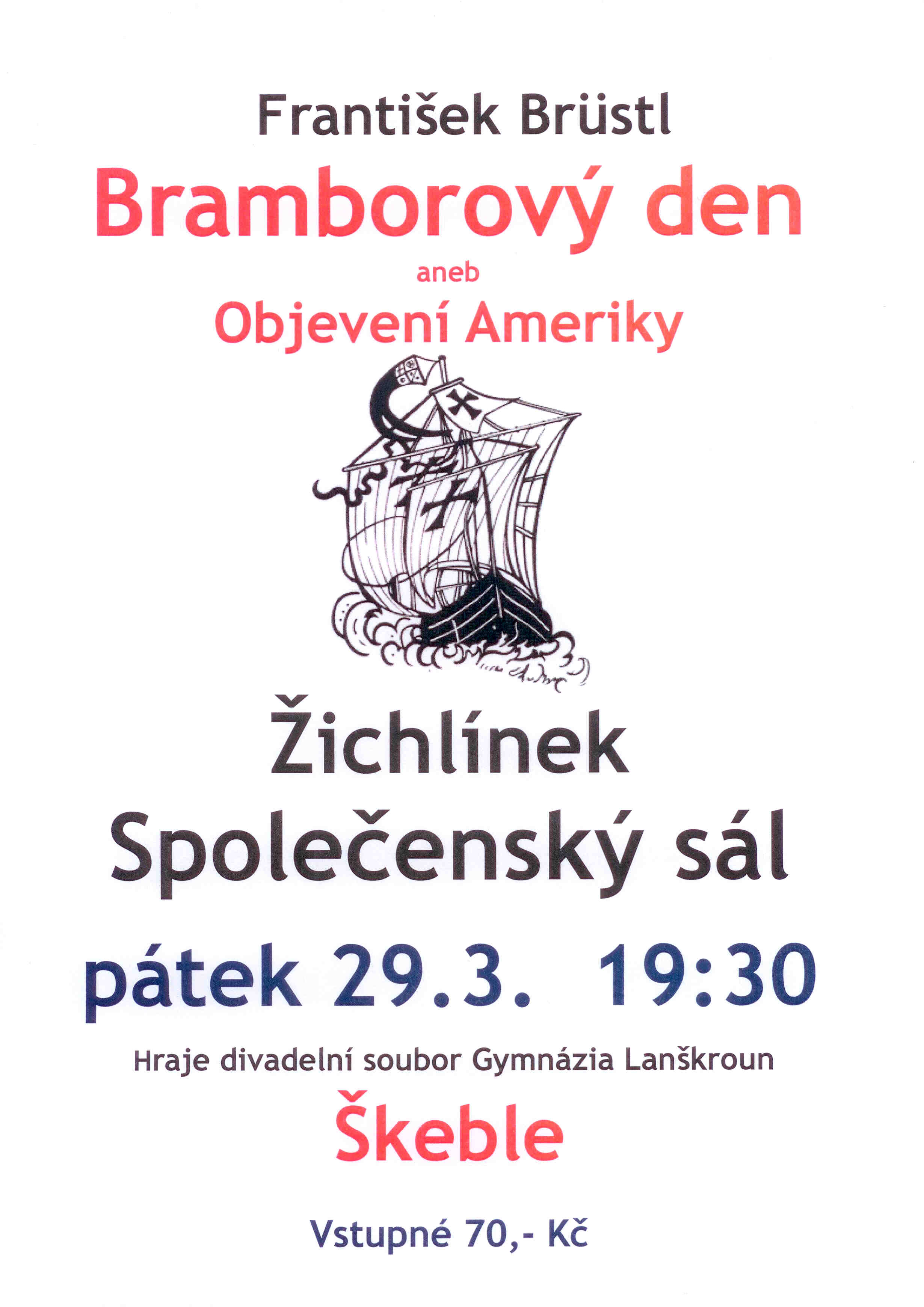 V pátek 29. března 2013 od 19:30 vystupuje ve Společenském sále v Žichlínku Škeble - divadelní soubor Gymnázia Lanškroun. Vystoupení se jmenuje Bramborový den aneb Objevení Ameriky. Více informací naleznete na plakátu v příloze.