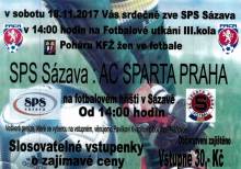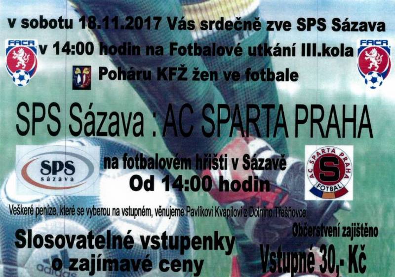 SPS Sázava Vás srdečně zve na fotbalové utkání III. kola Poháru KFŽ - SPS Sázava : AC Sparta Praha, které se koná 18. listopadu 2017 ve 14:00 hodin na fotbalovém hřišti v Sázavě. Vstupné 30,- Kč, občerstvení zajištěno.