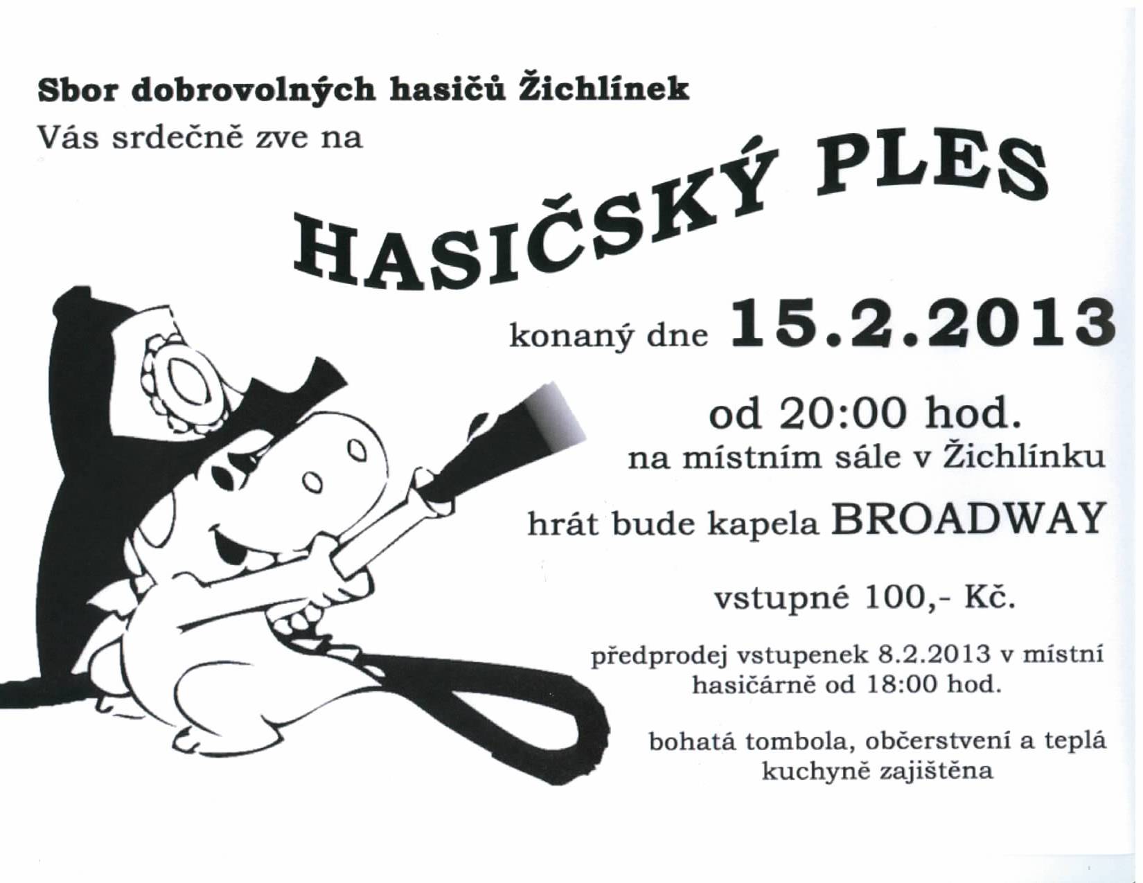 Sbor dobrovolných hasičů Žichlínek Vás srdečně zve na HASIČSKÝ PLES, který se koná 15. února 2013 od 20:00 hodin na sále v Žichlínku. K poslechu a tanci bude hrát kapela BROADWAY. Více informací naleznete na plakátu v příloze.