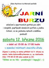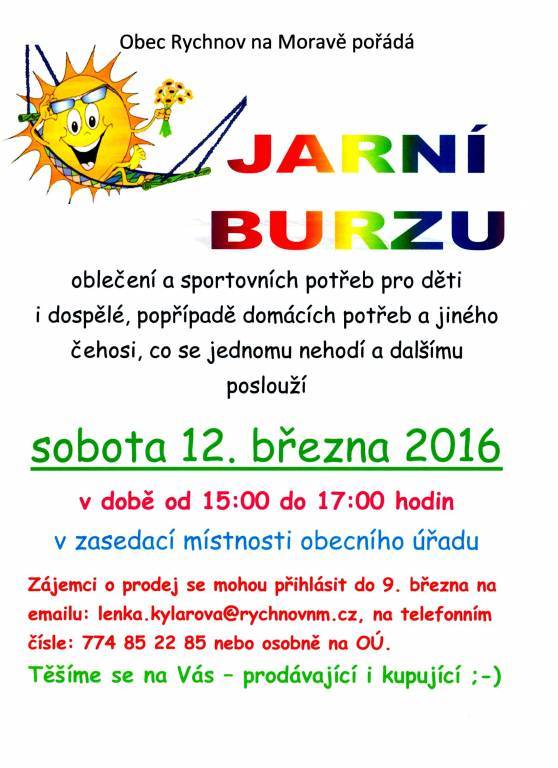 Obec Rychnov na Moravě pořádá JARNÍ BURZU oblečení a sportovních potřeb pro děti i dospělé, popřípadě domácích potřeb a jiného "čehosi", co se jednomu nehodí a dalšímu poslouží. Burza se koná v sobotu 12. března v době od 15:00 do 17:00 hodin v zasedací místnosti OÚ. Více informací naleznete na plakátu.