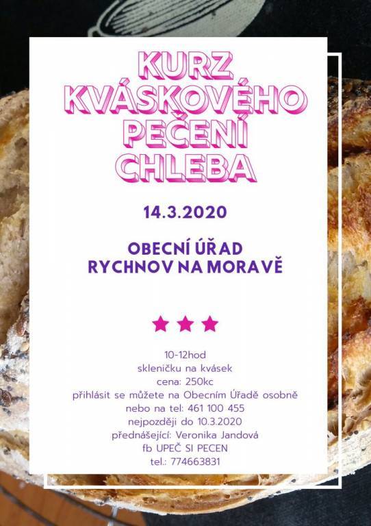 Srdečně Vás zveme na zajímavý kurz pečení kváskového chleba, který se uskuteční 14. března 2020 od 10 do 12 hodin v zasedací místnosti OÚ.