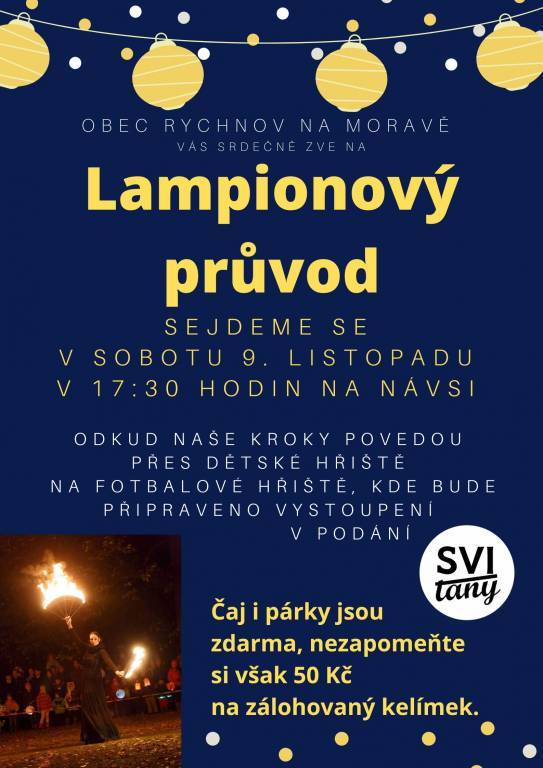 Obec Rychnov na Moravě srdečně zve malé i velké na LAMPIONOVÝ PRŮVOD, který se bude konat v sobotu 9. listopadu. Sejdeme se v 17:30 na návsi, odkud naše kroky povedou na fotbalové hřiště, kde bude připraveno vystoupení v podání SVITANY, dále čaj na zahřátí a párky na opečení.