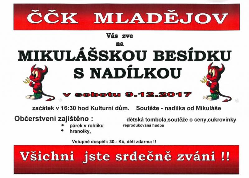 ČČK Mladějov na Moravě Vás zve na Mikulášskou besídku s nadílkou, která se koná v sobotu 9. prosince 2017 v kulturním domě v Mladějově. Začátek akce v 16:30 hodin. Těšit se můžete na soutěže a dětskou tombolu. Občerstvení zajištěno! Vstupné: 30,- Kč, děti ZDARMA. Všichni jste srdečně zváni!