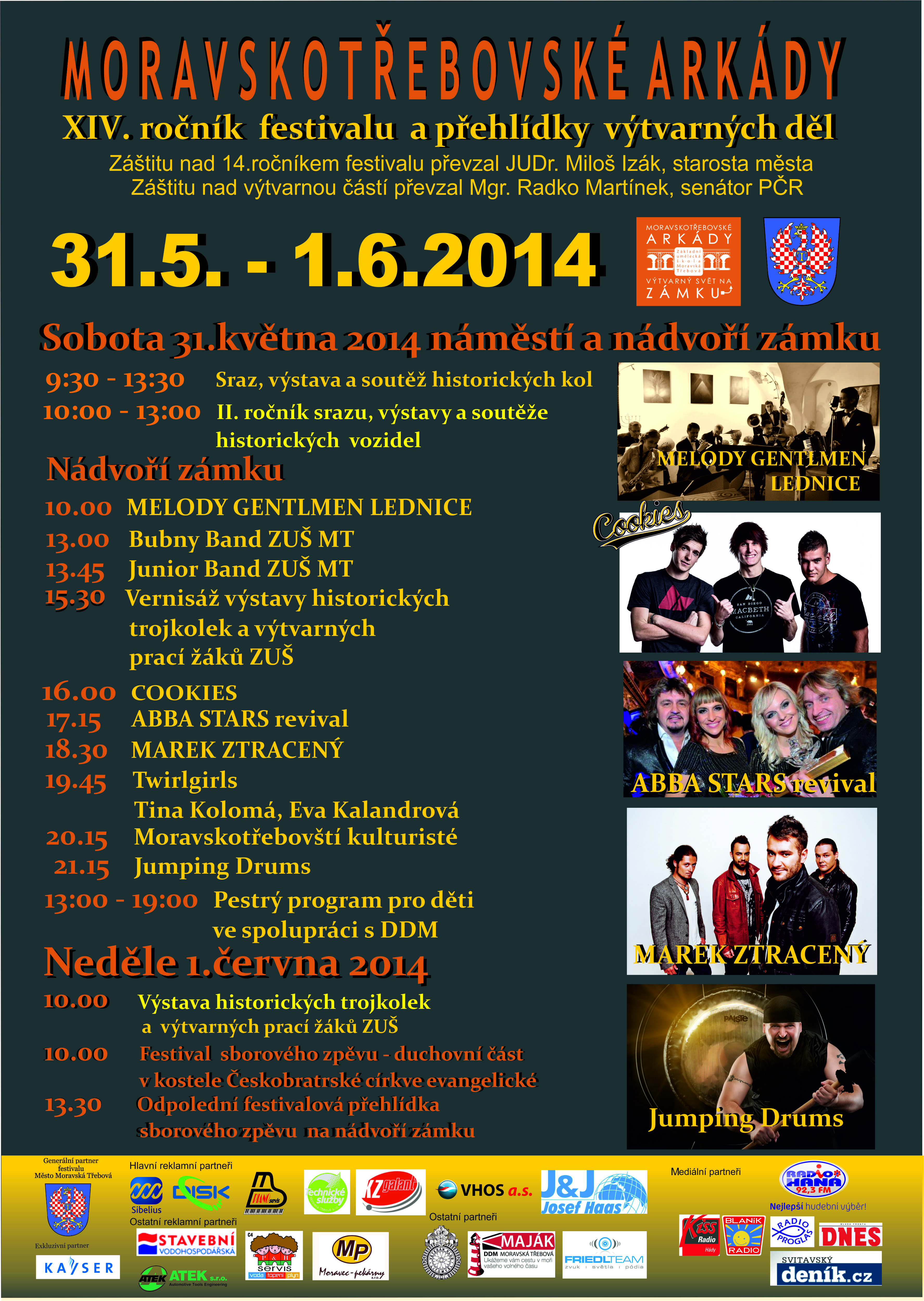 XIV. ročník festivalu a přehlídky výtvarných děl Moravskotřebovské arkády se koná 31. 5. - 1. 6. 2014 v nádvoří zámku v Moravské Třebové. Více informací o programu akce naleznete na plakátu v příloze.