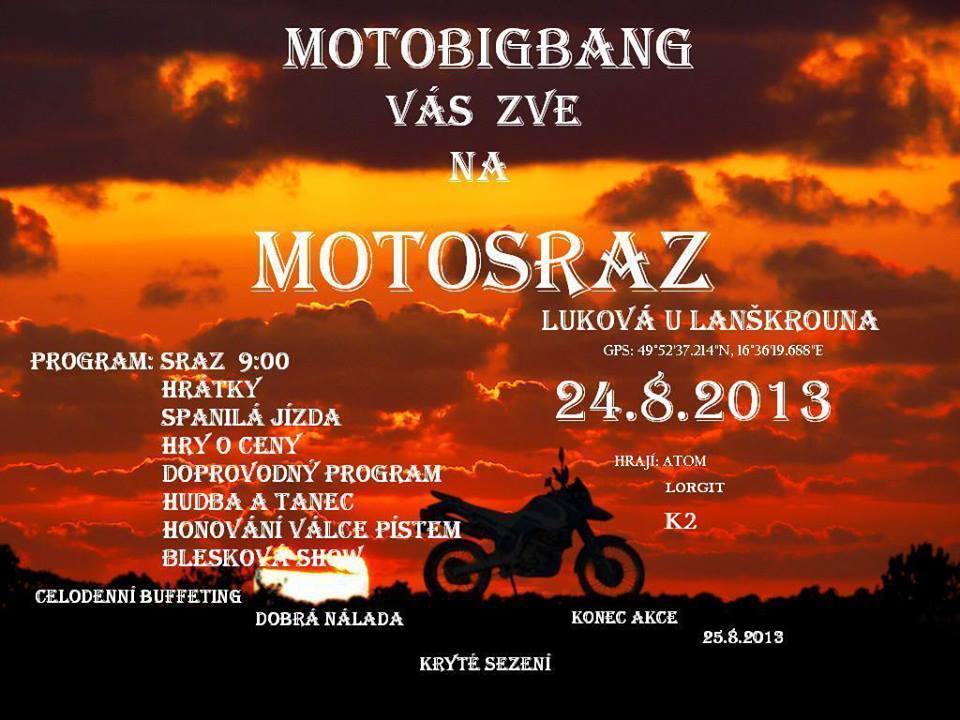 Motobigbang Vás zve na MOTOSRAZ, který se koná v sobotu 24. srpna 2013 od 9:00 hodin v Lukové. Více informací naleznete na plakátu v příloze. Výtěžek z této akce poputuje do dětského domova v Dolní Čermné.