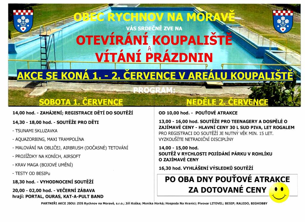 OTEVÍRÁNÍ KOUPALIŠTĚ A VÍTÁNÍ PRÁZDNIN - největší akce tohoto roku, kterou pořádá obec Rychnov na Moravě se koná v termínu 1. -2. července 2017 na místním koupališti. Začínáme v sobotu 1. července ve 14:00 hodin, kdy proběhne zahájení a poté registrace dětí do soutěží, které budou probíhat v době 14:30 - 18:00 hodin. Pro děti i dospělé budou k dispozici maxi skluzavka TSUNAMI, malování na obličej a airbrush, stánek KRAV MAGA a jízdy na koních. V 18:30 proběhne vyhodnocení soutěží a ve 20:00 hodin začíná večerní zábava s regionálními kapelami PORTAL, OURAS, KAT-A-PULT.