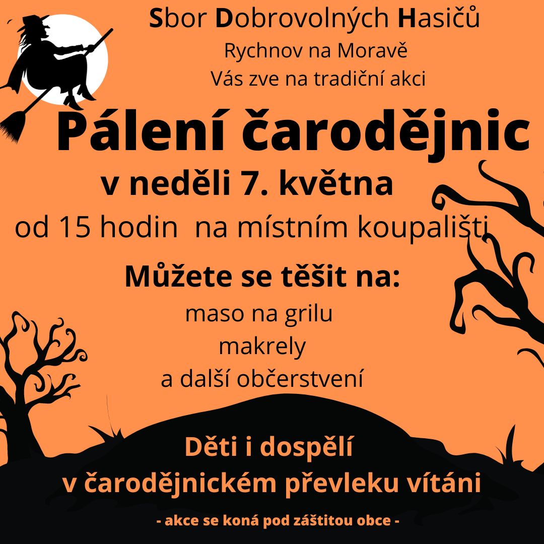 Sbor Dobrovolných Hasičů Rychnov na Moravě Vás srdečně zve na tradiční akci - PÁLENÍ ČARODEJNIC. Koná se v neděli 7. května od 15. hodin na místním koupališti. Připraveno bude bohaté občerstvení, maso na grilu i makrely. Ďěti i dospělí v čarodejnickém převleku vítáni.