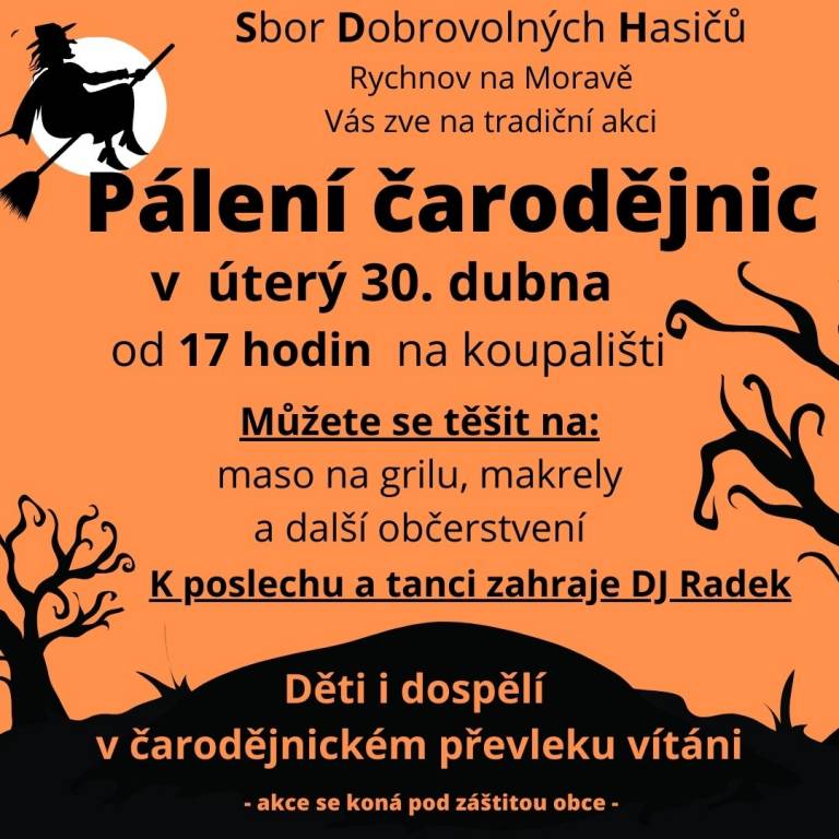 Sbor Dobrovolných Hasičů Rychnov na Moravě Vás srdečně zve na trdiční akci v tradičním termínu - PÁLENÍ ČARODĚJNIC. Koná se v úterý 30. dubna od 17 hodin na místním koupališti.