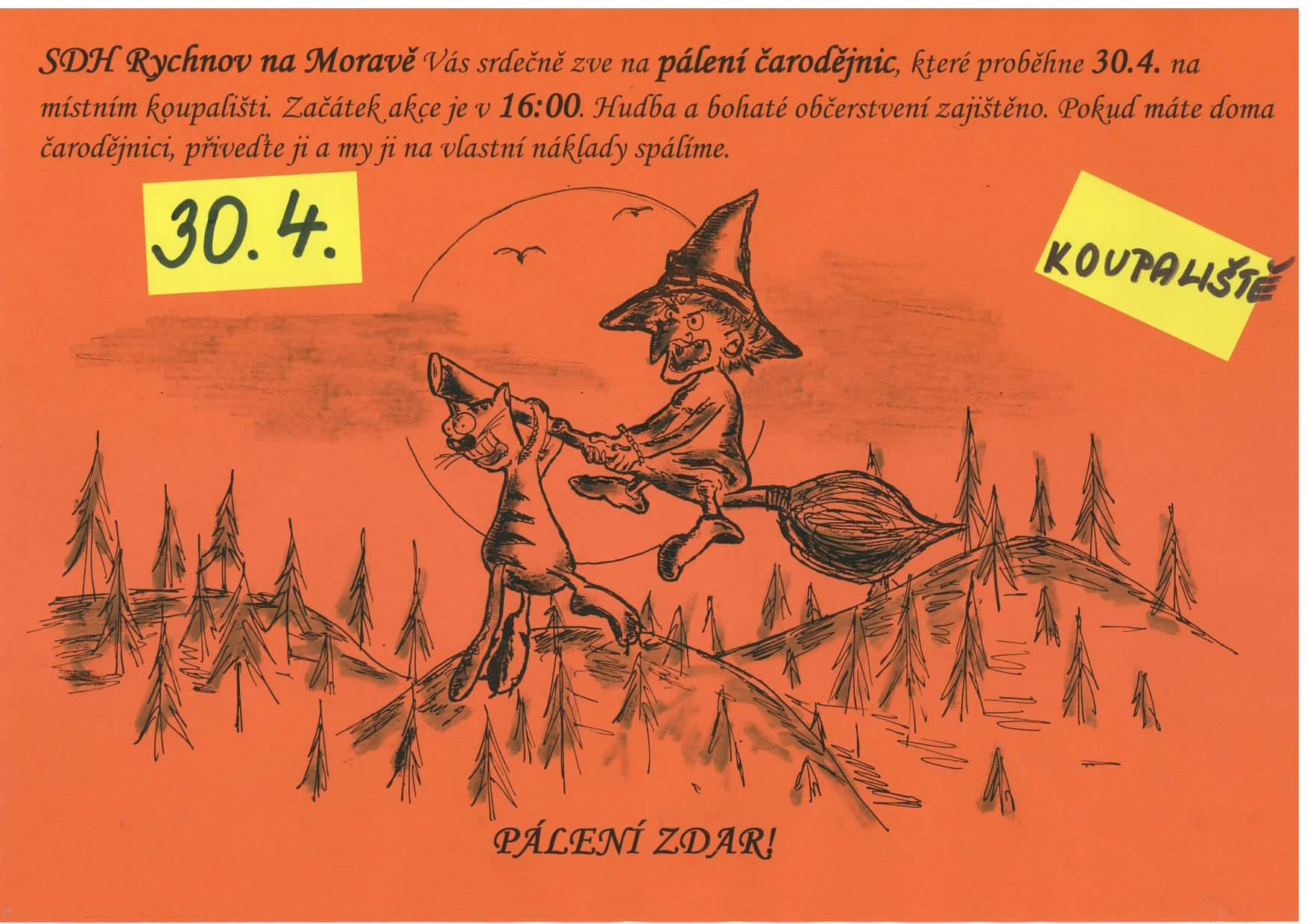 SDH Rychnov na Moravě Vás srdečně zve na PÁLENÍ ČARODĚJNIC, které proběhne 30. dubna na místním koupališti. Začátek akce je v 16:00 hodin. Hudba a bohaté občerstvení je zajištěno. Plakát naleznete v příloze.