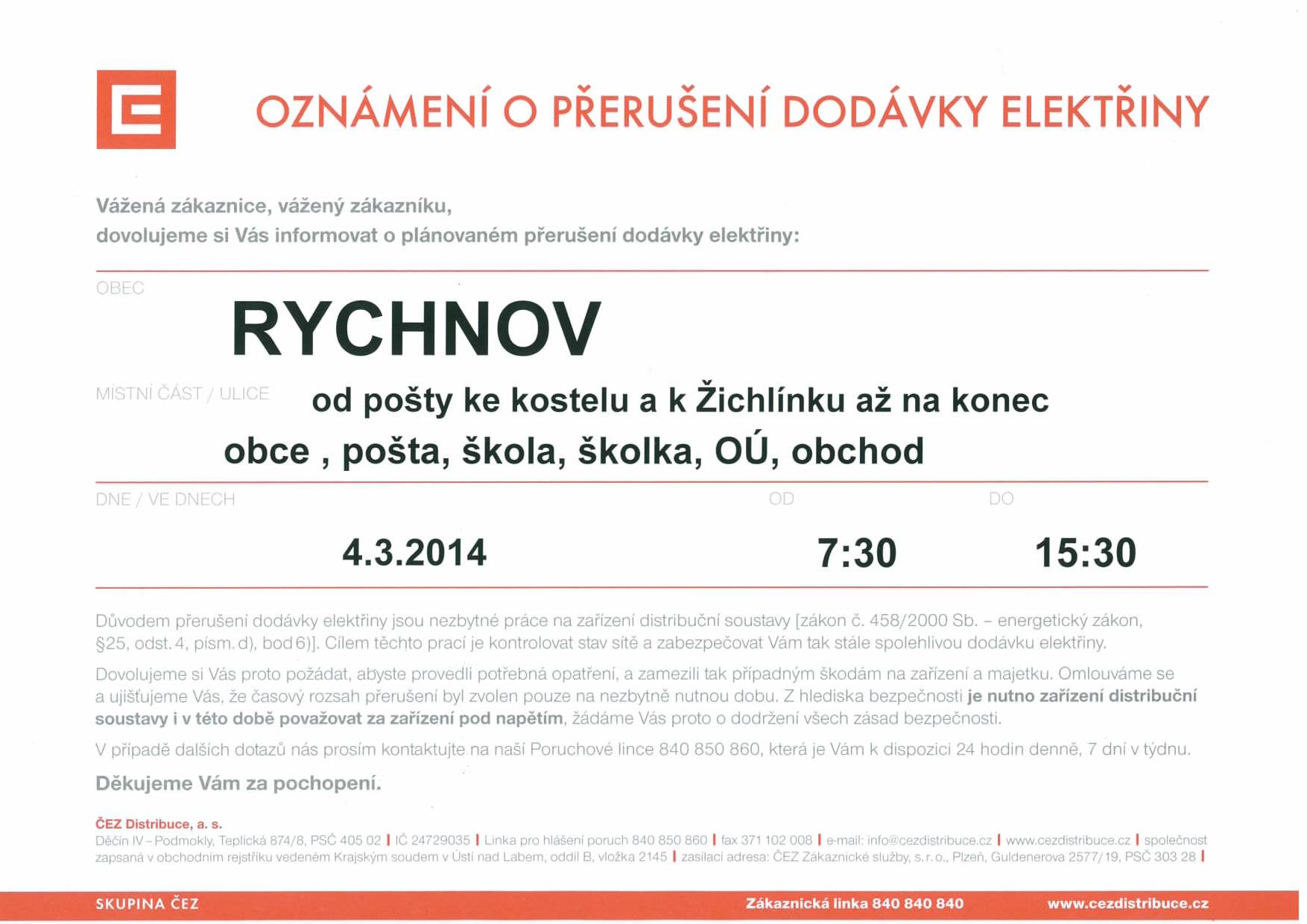Společnost ČEZ s.r.o. si dovoluje informovat občany o plánovaném přerušení dodávky elektřiny, které bude v úterý 4. března 2014 od 7:30 do 15:30 hodin. Přerušení se týká části obce od pošty až po konec obce směr Žichlínek. Podrobné informace naleznete na plakátu v příloze.