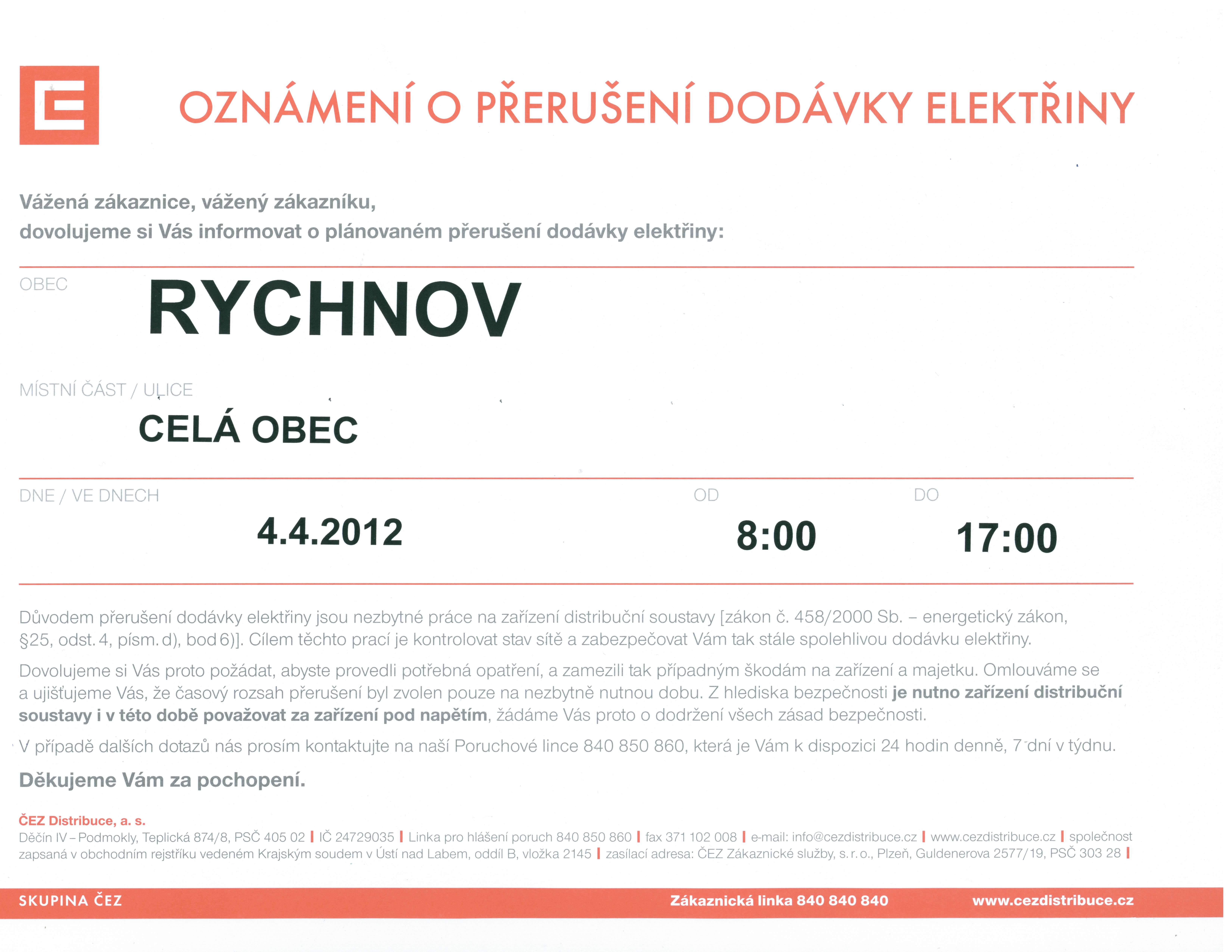 společnost ČEZ Distribuce, a. s. si Vás dovoluje informovat o přerušení dodávky elektřiny v celé obci, která je plánována na středu 4. 4. 2012 od 8:00 do 17:00 hodin.