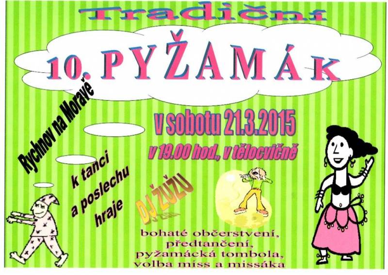Sdružení přátel Rychnova Vás srdečně zve na tradiční 10. PYŽAMÁK, který se koná v sobotu 21. března 2015 v 19 hodin v tělocvičně v Rychnově na Moravě. Připraveno je občerstvení, předtančení a pyžamácká tombola, ve které je hlavní cenou ŠTÍPAČKA NA DŘÍVÍ. Dále je připravena volba miss a missáka. K poslechu a tanci hraje DJ ŽUŽU.