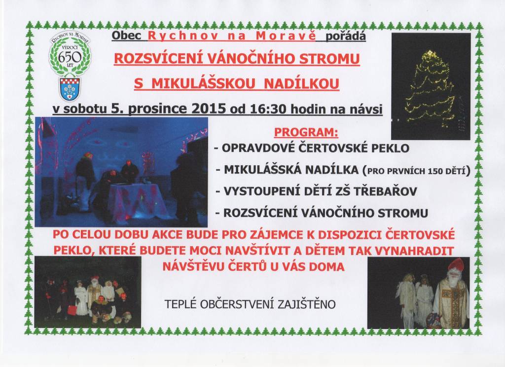 Program akce: opravdové čertovské peklo, vystoupení dětí ZŠ Třebařov, rozsvícení vánočního stromu a Mikulášská nadílka. Plakát naleznete v příloze.