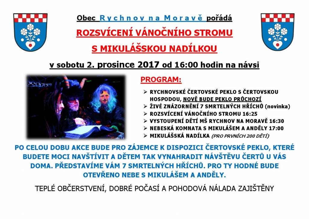 Obec Rychnov na Moravě Vás srdečně zve na ROZSVÍCENÍ VÁNOČNÍHO STROMU S MIKULÁŠSKOU NADÍLKOU, které se koná v sobotu 2. prosince 2017 od 16:00 hodin na návsi. Těšit se můžete na peklo s čertovskou hospodou, živé znázornění sedmi smrtelných hříchů, rozsvícení vánočního stromu, vystoupení dětí z MŠ a mnoho dalšího! Po celou dobu akce bude zajištěno teplé občerstvení!