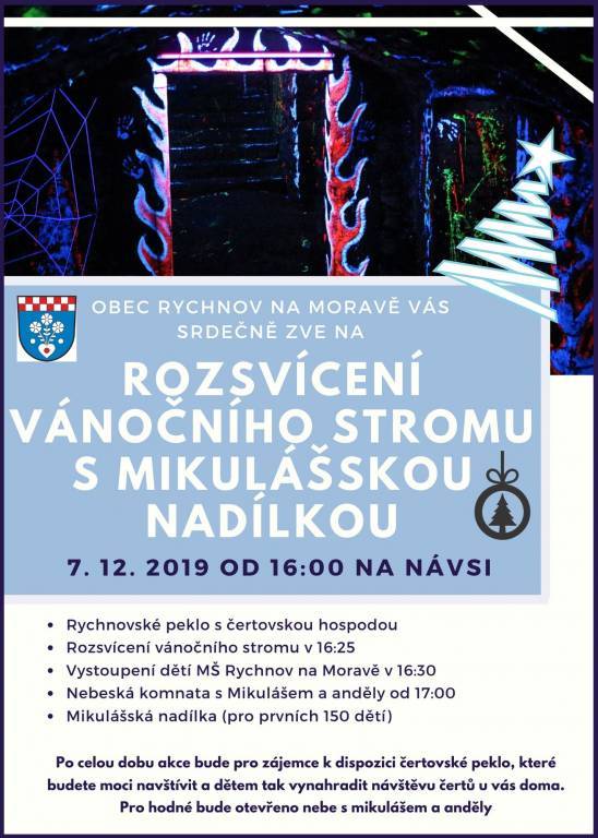 7. prosince proběhne v naší obci tradiční rozsvícení vánočního stromu s mikulášskou nadílkou. Sraz bude v 16h na návsi. Na programu bude rozsvícení vánočního stromu v 16:25, vystoupení dětí z MŠ Rychnov v 16:30 a nebeská komnata s mikulášem a anděly od 17:00. Na prvních 150 dětí čeká mikulášská nadílka.