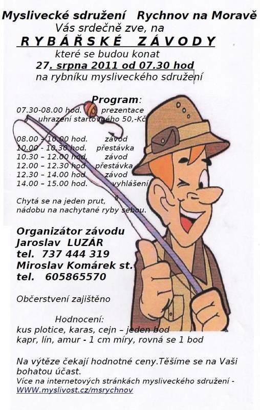 Myslivecké sdružení Rychnov na Moravě Vás srdečně zve na RYBÁŘSKÉ ZÁVODY, které se budou konat 27. srpna 2011 od 07.30 hod na rybníku mysliveckého sdružení.