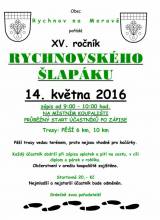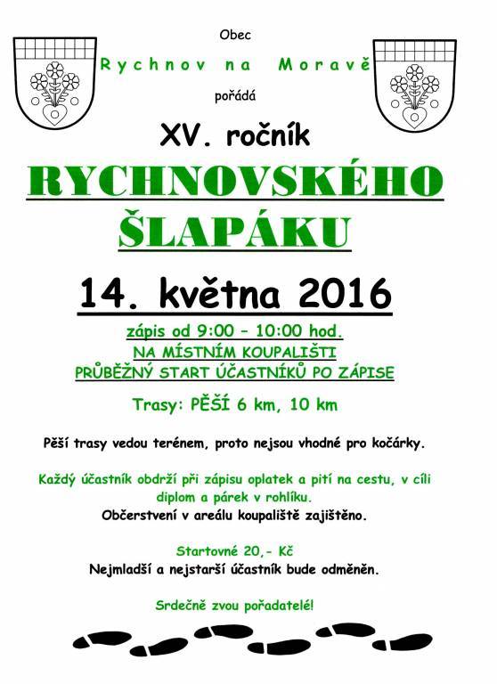 Obec Rychnov na Moravě Vás srdečně zve na XV. ročník Rychnovského šlapáku, který se bude konat v sobotu 14. května 2016. Zápis účastníků bude probíhat mezi 9:00 - 10:00 hodin na místním koupališti, průběžný start účastníků bude následovat po zápise. Jsou připraveny trasy 6 a 10 km pro pěší. Více informací naleznete na plakátu v příloze.