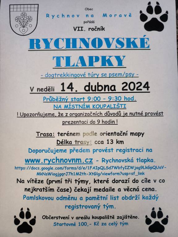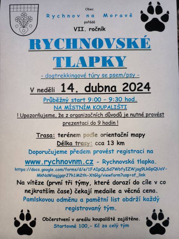 Obec Rychnov na Moravě zve všechny příznivce pohybu a milovníky psů na dogtrekkingovou túru. Koná se v neděli 14. dubna. Pro účast je nutná předchozí registrace, kterou můžete provést zde. (Upozorňujeme, že z organizačních důvodů je nutné provést prezentaci do 9 hodin!) Průběžný start 9:00 - 9:30 z koupaliště. Tresa vede terénem podle orientační mapy a je dlouhá cca 13 km. Na vítěze (první tři týmy v kategorii muži a ženy, kteří dorazí do cíle v nejkratším čase) čeká medaile a věcná cena. Pamlskovou odměnu a pamětní list obdrží každý registrovaný tým. Startovné 100,- Kč/tým, splatný v místě konání.