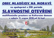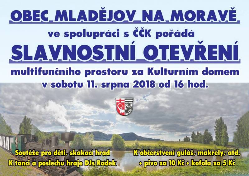 Obec Mladějov na Moravě ve spolupráci s ČČK pořádá Slavnostní otevření multifunkčního prostoru za kulturním domem v Mladějově na Moravě. Akce se koná v sobotu 11. srpna 2018 od 16:00 hod. Bohaté občerstvení zajištěno, pivo 10,- Kč, Kofola 5,- Kč, soutěže a skákací hrad pro děti.