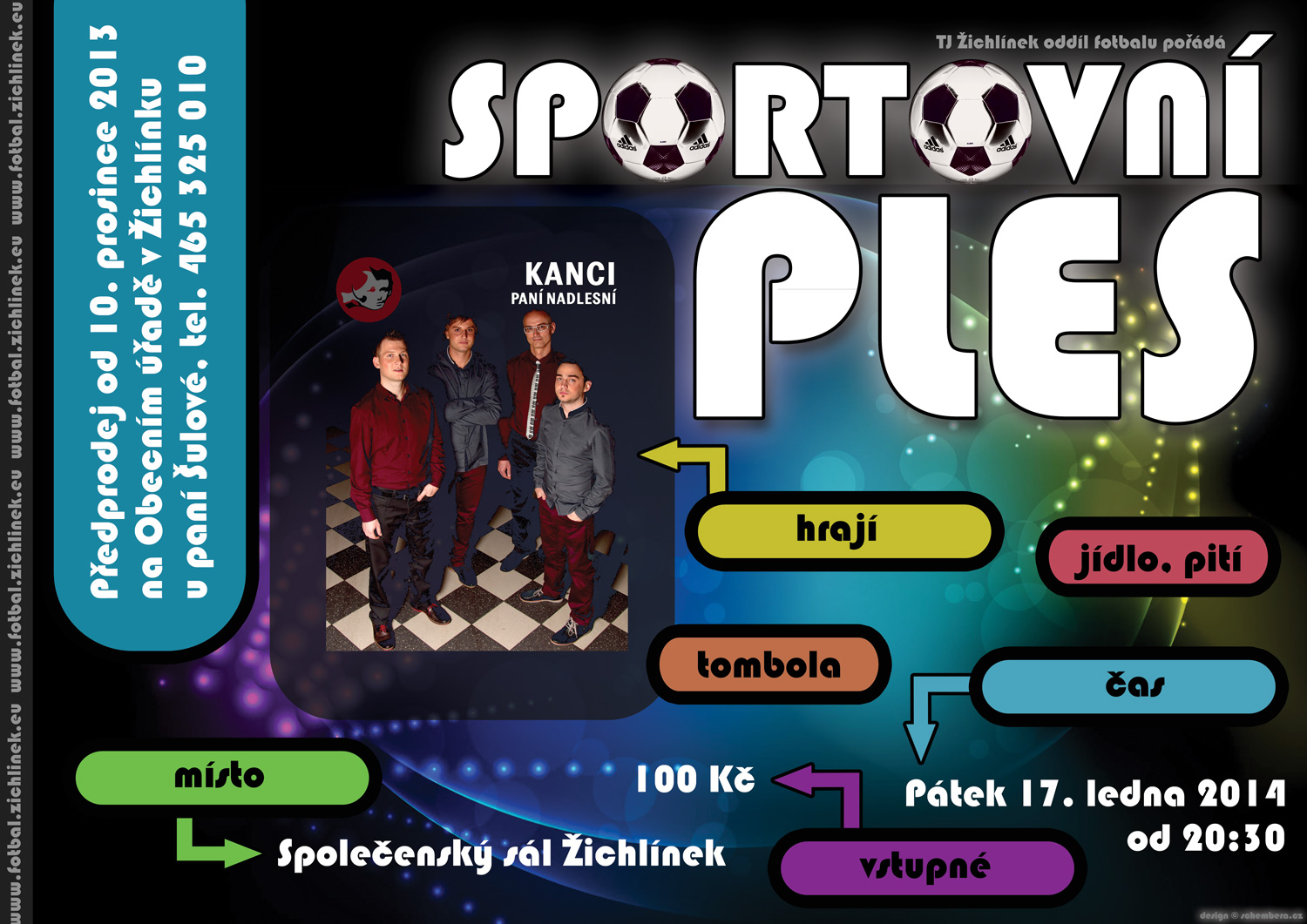 TJ Žichlínek oddíl fotbalu pořádá Sportovní ples, který se koná v pátek 17. ledna 2014 od 20:30 ve společenském sále v Žichlínku. K poslechu a tanci hrají KANCI PANÍ NADLESNÍ. Více informací naleznete na plakátu v příloze.