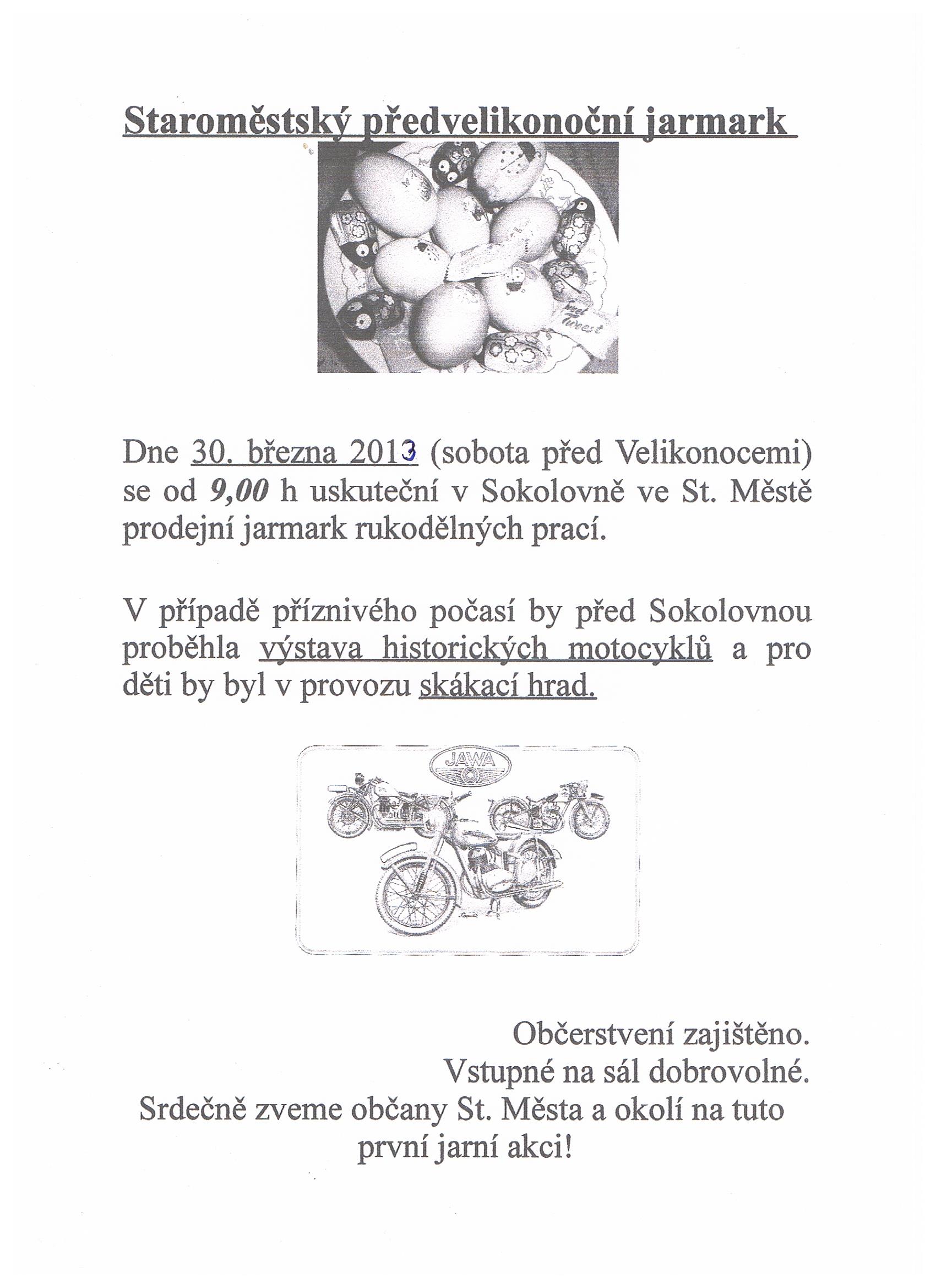 30. března 2013 se od 9:00 hodin uskuteční v Sokolovně ve Starém Městě prodejní jarmark rukodělných prací. V případě příznivého počasí by před Sokolovnou proběhla výstava historických motocyklů a pro děti by byl k dispozici skákací hrad. Více informací naleznete na plakátu v příloze.