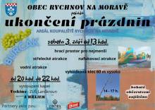 Srdečně zveme na akci Ukončení prázdnin, které se bude konat tuto sobotu 3. září od 13 hodin na místním koupališti. Připravena bude vyhlídková klec do výšky 60 metrů, vodní, střelecké a nafukovací atrakce a bohuté občerstvení. Od 20 do 22 hodin vystoupení dvou začínajících kapel - Vokins a A hrajem.