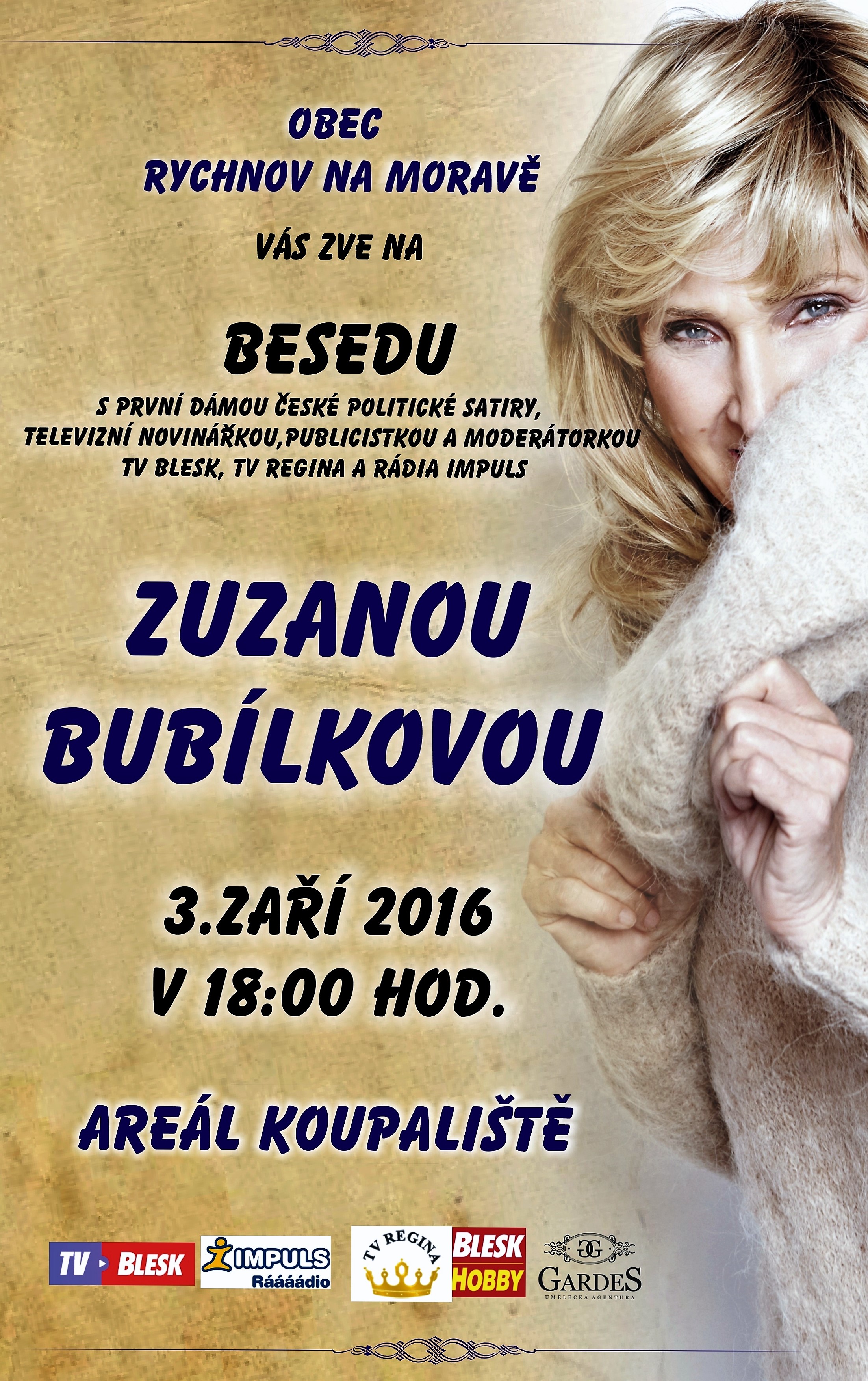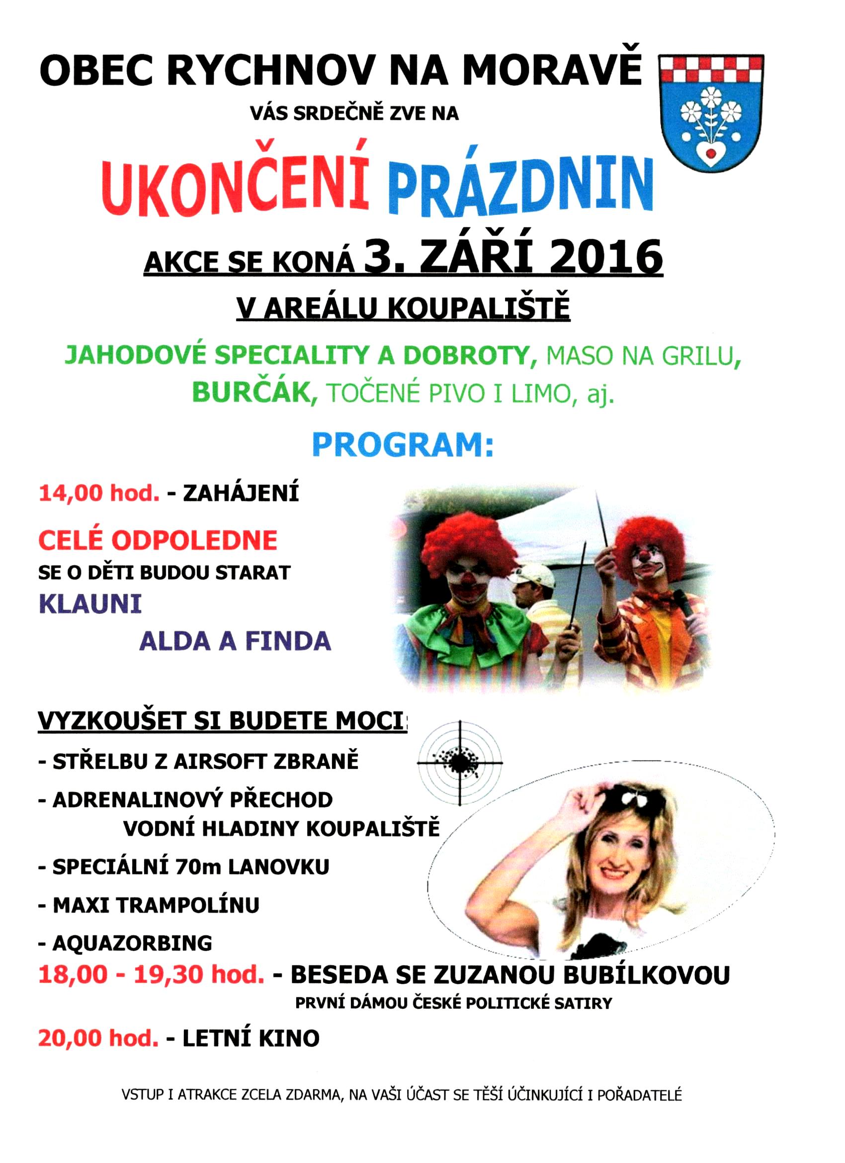 Obec Rychnov na Moravě Vás srdečně zve na UKONČENÍ PRÁZDNIN, které se bude konat v sobotu 3. září od 14 hodin na místním koupališti. O děti se budou celé odpoledne starat klauni Alda a Filda, pro větší a odvážné je připraven adrenalinový přechod vodní hladiny koupaliště, 70m dlouhá lanovka, střelba z airsoft pistole, maxi trampolína a aquazorbing - toť vše zcela zdarma. V 18 hodin začíná beseda s první dámou České politické satiry - ZUZANOU BUBÍLKOVOU. Od 20:00 hodin promítáme LETNÍ KINO.