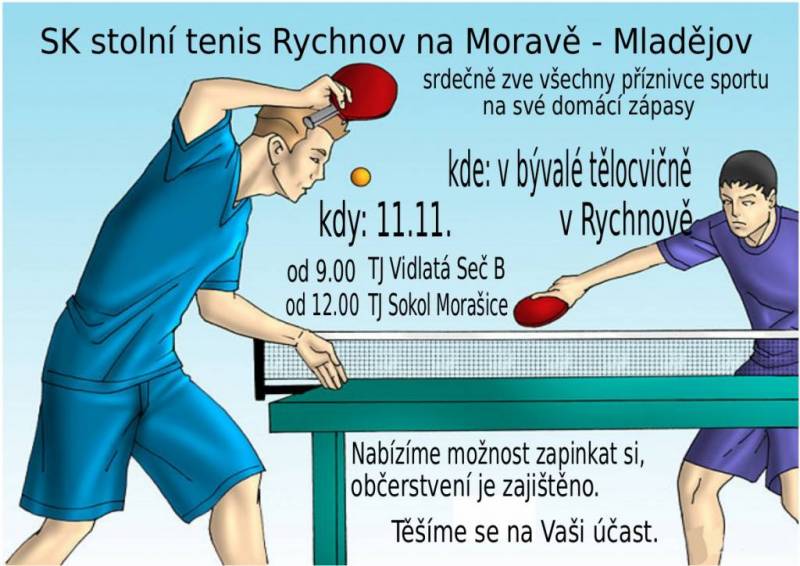 Srdečně zveme příznivce sportu na utkání ve stolním tenise, které se bude konat v sobotu 11. listopadu od 9:00 hodin v místní tělocvičně. Bude k dispozici i jeden stůl, na kterém si budou moci zájemci zahrát. Občerstvení je zajištěno.