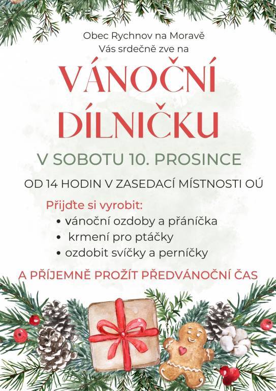 Srdečně Vás zveme na Vánoční dílničku, která se bude konat v sobotu 10. prosince od 14 hodin v zasedací místnosti OÚ. Přijďte příjmně prožít předvánoční čas a něco hezkého si vyrobit. Občerstvení je zajištěno.