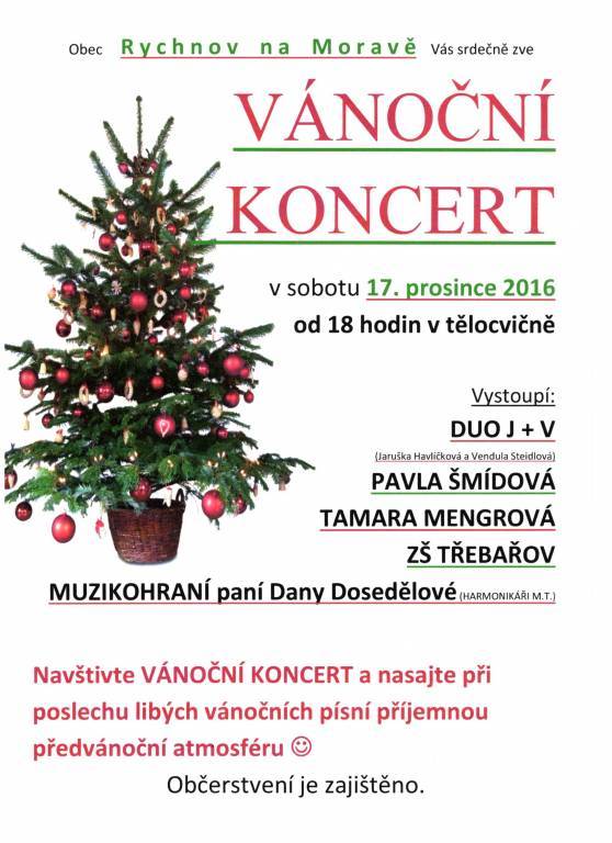 Obec Rychnov na Moravě Vás srdečně zve na VÁNOČNÍ KONCERT, který se koná v sobotu 17. prosince od 18 hodin v místní tělocvičně. Vystoupí Duo J + V, Pavla Šmídová, Tamara Mengrová, ZŠ Třebařov a Muzikohraní paní Dany Dosedělové. Navštivte VÁNOČNÍ KONCERT a nasajte při poslechu libých vánočních písní příjemnou předvánoční atmosféru.