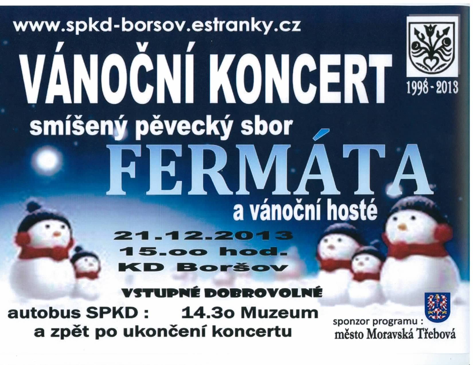 Sdružení přátel kulturního domu pořádá VÁNOČNÍ KONCERT smíšeného pěveckého sboru FERMÁTA a vánoční hosté, který se koná 21. prosince 2013 od 15:00 hodin v kulturním domě v Boršově. Více informací naleznete na plakátu v příloze.