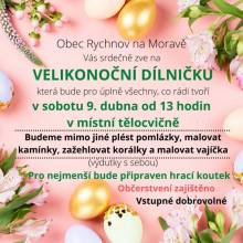 Srdečně zveme na Velikonoční dílničku, která se bude konat v sobotu 9. dubna od 13 hodin v tělocvičně. Budeme mimo jiné plést pomlázky, malovat kamínky, zažehlovat korálky a malovat vajíčka (výdutky s sebou). Pro nejmenší bude připraven hrací koutek. Občerstvení zajištěno. Vstupné je dobrovolné, sloužící jako příspěvek na použítý materiál. Těšíme se na Vás. Plakát naleznete v příloze.