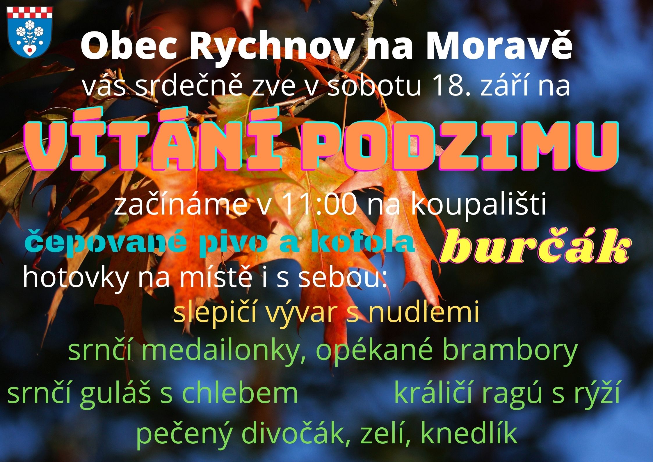 Obec Rychnov na Moravě vas srdečně zve na sobotu 18. září, kdy společně budeme dobrý jídlem a pitím na koupališti VÍTAT PODZIM. Začínáme v 11 hodin.