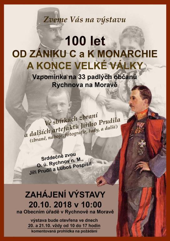 Zveme všechny příznivce historie na výstavu s názvem "100 let od zániku c. a k. monarchie a konce Velké války", která se koná jako vzpomínka na padlé občany naší obce. Výstava se uskuteční v sobotu 20. října a v neděli 21. října od 10:00 do 17:00 hod. v zasedací místnosti obecního úřadu. K vidění bude sbírka zbraní, nábojů, fotografií a dalších historických předmětů.