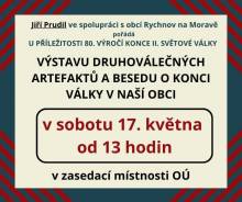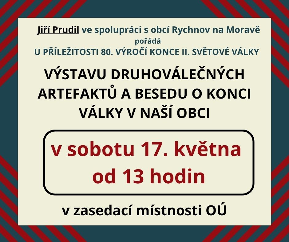 Jiří Prudil ve spolupráci s obcí Rychnov na Moravě pořádá u příležitosti 80. výročí konce II. světové války VÝSTAVU DRUHOVÁLEČNÝCH ARTEFAKTŮ A BESEDU O KONCI VÁLKY V NAŠÍ OBCI, která se bude konat v sobotu 17. května od 13 hodin v zasedací místnosti OÚ.