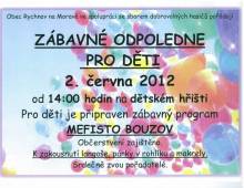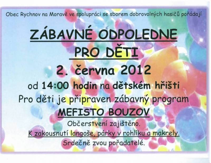 Obec Rychnov na Moravě ve spolupráci se sborem dobrovolných hasičů pořádají v sobotu 2. června 2012 ZÁBAVNÉ ODPOLEDNE PRO DĚTI. Od 14:00 hodin je připraven zábavný program MEFISTO BOUZOV. Více informací naleznete na plakátu v příloze.